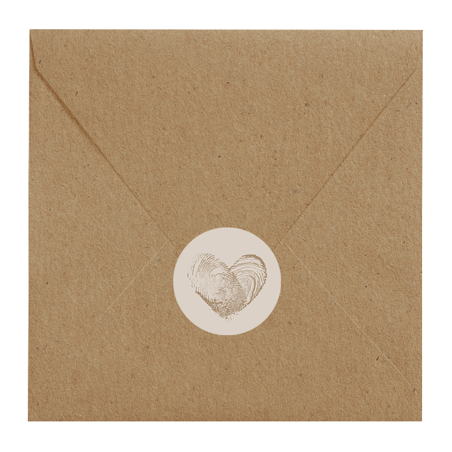 Ronde beige sticker met vingerprint in de vorm van een hartje, passend bij de fingerprint geboortekaartjes geïnspireerd op het kaartje van Anne Vedder.
