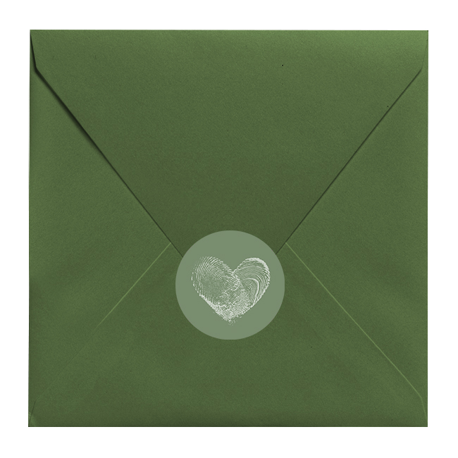 Ronde groene sticker met vingerafdrukken in de vorm van een hartje, passend bij de fingerprint geboortekaartjes geïnspireerd op het kaartje van Anne Vedder.
