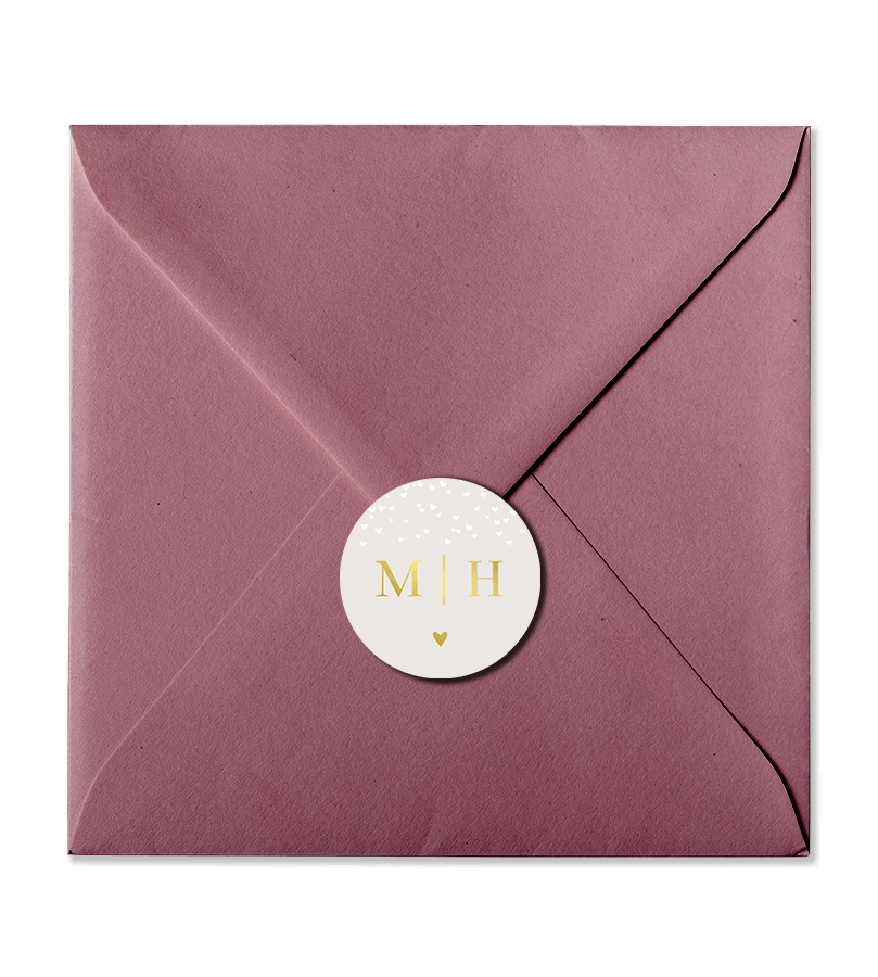 Romantische luxe sticker met vallende hartjes en initialen. De goudfolie geeft een luxe uitstraling aan deze sticker. Gebruik deze sticker als sluitsticker voor de envelop of voor op bijvoorbeeld een trouwbedankje.