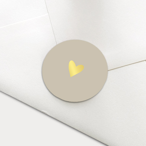 Ronde neutrale zandkleurige sticker met goudfolie hartje, passend bij de unisex geboortekaartjes geïnspireerd op het kaartje van Esther Vedder.