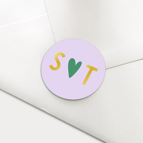 Ronde sticker met lila achtergrond, goudfolie initialen en een groen hartje. Het goudfolie zorgt voor een extra vleugje luxe.