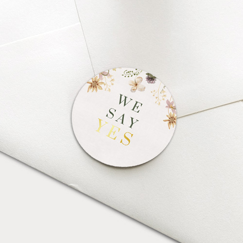 Mooie ronde sluitsticker voor een envelop. Op deze sluitsticker veldbloemen en de tekst 'we say yes'. De goudfolie geeft een luxe touch aan deze sticker. Perfect voor de envelop van je trouwkaart.