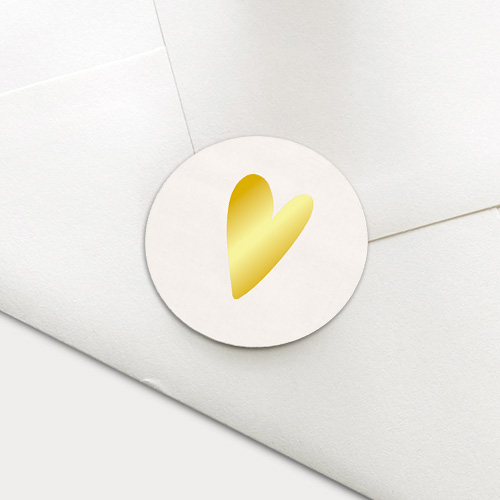 Luxe sticker met beige linnenlook achtergrond en hartje in echt goudfolie. Deze luxe ronde sluitsticker is perfect om de envelop van je trouwkaart of het geboortekaartje van je zoon of dochter mee dicht te plakken.
