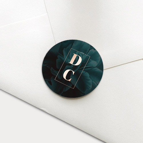 Ronde luxe sluitsticker envelop met bloem en initialen
