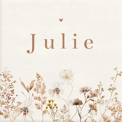 Geboortetegeltje voor een meisje met een lichte linnenlook achtergrond en bruin beige veldbloemen. Deze geboortetegel Julie heeft een rustige en romantische uitstraling en kun je naar je eigen smaak aanpassen.