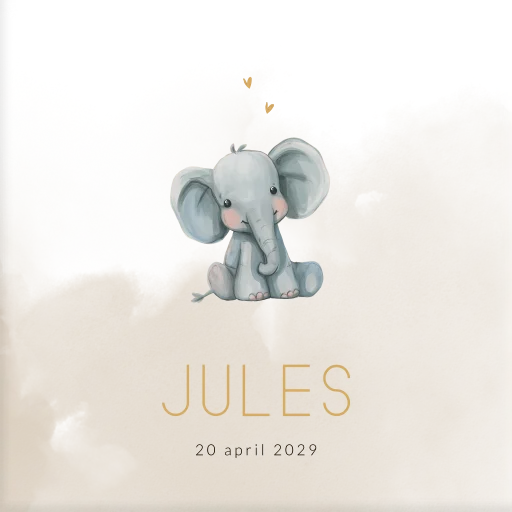Geboortetegeltje voor een jongen of meisje met een aquarel achtergrond met een lief grijs olifantje. Deze geboortetegel Jules heeft een rustige neutrale uitstraling en kun je naar je eigen smaak aanpassen.