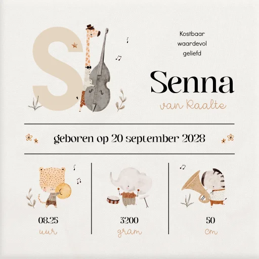 Geboortegegevens unisex geboortetegeltje met dieren en muziek