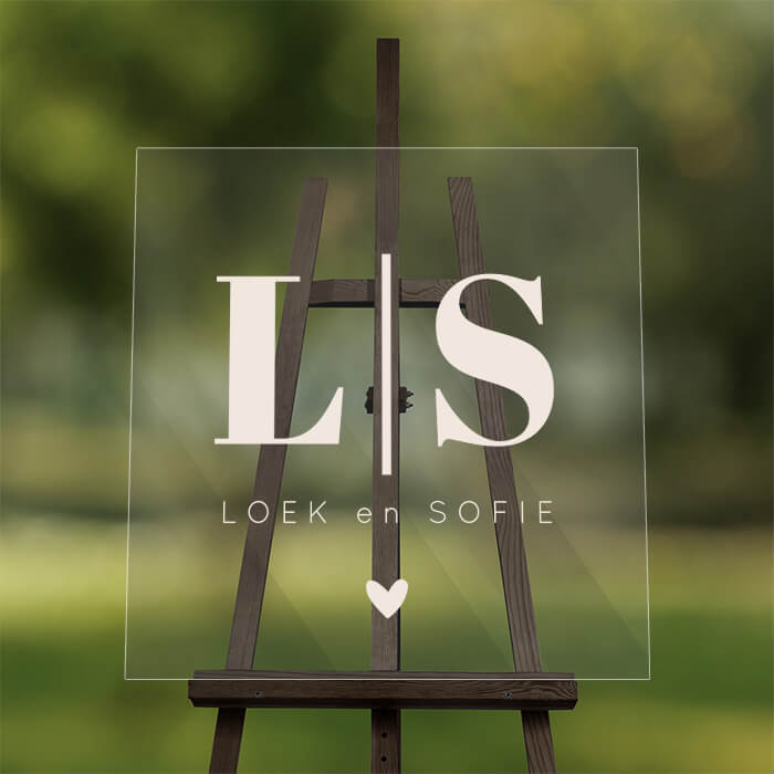 Doorzichtig welkomstbord van acryl met initialen voor een bruiloft