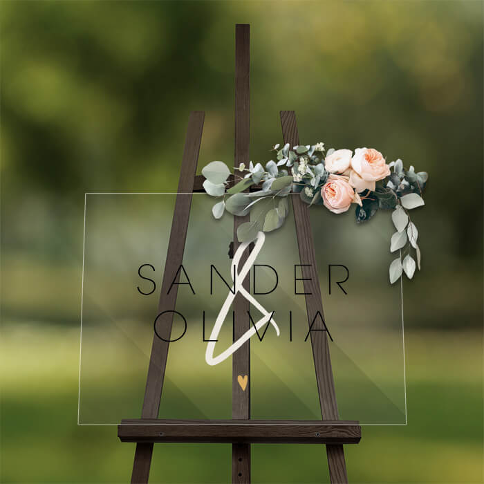 Welkomstbord voor op een bruiloft in minimalistische stijl. Dit doorzichtige welkomstbord in acryl is de perfecte aanvulling op een bruiloft of ander groot feest. Het bord is voorzien van een groot &-teken met jullie namen en een goudkleurig hartje. Hulp nodig bij het aanpassen van het ontwerp? Bel, mail of chat ons gerust. Wij helpen je graag!
