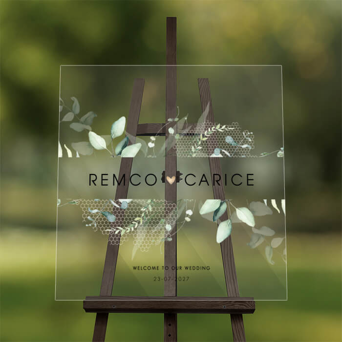 Dit doorzichtige welkomstbord is perfect voor een stijlvolle bruiloft. Het is gemaakt van acryl en heeft een botanisch ontwerp met takjes en goudkleurig hartje. Zet in het midden jullie namen als bruidspaar en verwelkom al je gasten hiermee op jullie bruiloft. Formaat 80 x 80 cm.