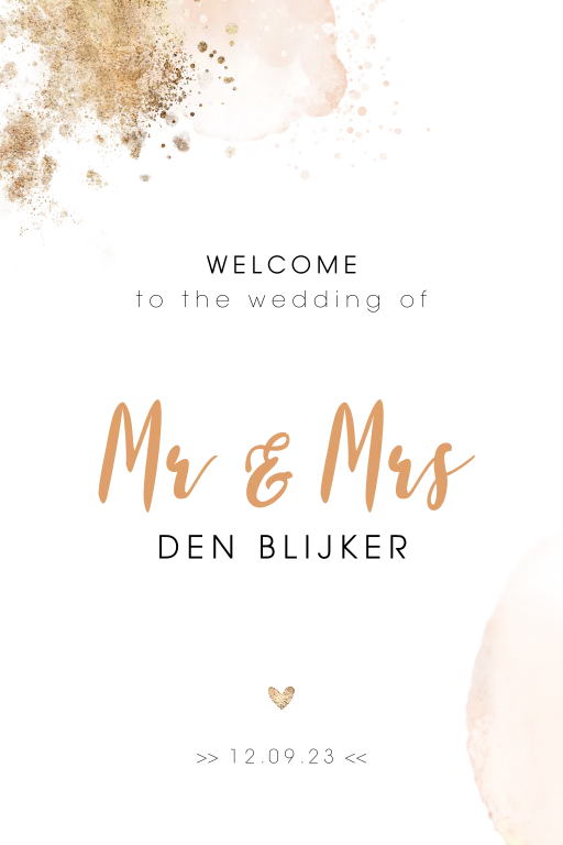 Aquarel bruiloftsbord van de kersverse Mr en Mrs! Met dit persoonlijke tuinbord met gouden spetters, misschien wel in de stijl van jullie trouwkaart, heet je al jullie gasten welkom. De tekst is eenvoudig aan te passen in onze editor. Formaat 40 x 60 cm.