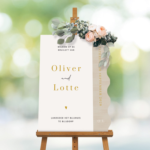 Met dit welkomstbord voor een bruiloft heet je al jullie gasten op een unieke manier welkom. Dit welkomstbord heeft een bijzondere organische vorm van golven. Jullie namen en de trouwdatum pas je eenvoudig aan in onze editor.
