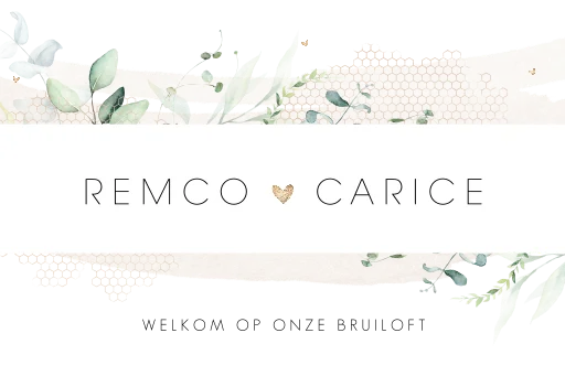 Dit hippe bruiloftsbord is ideaal om jullie gasten op de dag van jullie dromen, op een heel persoonlijke manier welkom te heten. De namen van het bruidspaar staan in het midden van het tuinbord met daar omheen eucalyptus takken in mooie zachtgroene tinten voor een aquarel achtergrond. Het honingraatpatroon op dit welkomstbord geeft een leuk effect.
