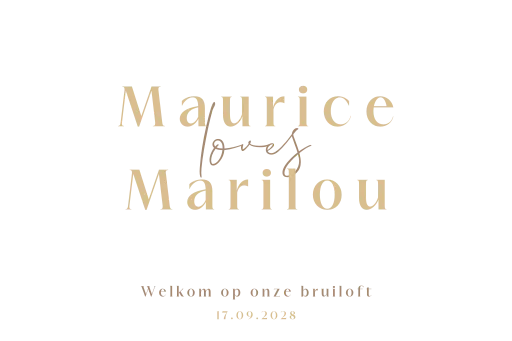 Dit prachtige, strakke welkomstbord voor jullie bruiloft is een perfecte manier om jullie gasten te begroeten en een persoonlijk tintje te geven aan jullie speciale dag. De namen van het bruidspaar staan in neutrale kleurtinten in het midden van het tuinbord met een witte achtergrond. Pas het welkomstbord naar eigen wens aan in onze online editor. Het formaat van het welkomstbord is 60 x 40 cm.| Totaalprijs: 0 |