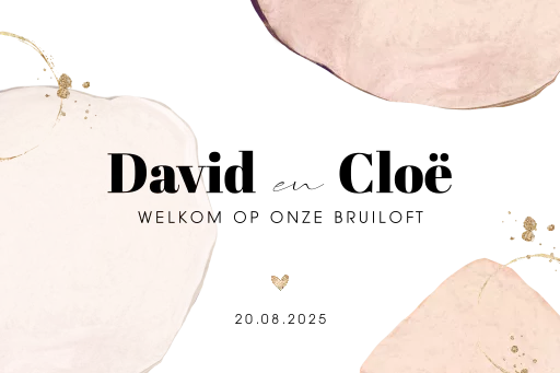 Hip welkomstbord met mooie abstracte vormen in aquarel, om bijvoorbeeld bij de ingang van jullie trouw locatie te plaatsen. De gasten voelen zich gelijk helemaal welkom op jullie bruiloft wanneer ze dit sfeervolle tuinbord zien met zachtroze tinten en kleine gouden accenten. Formaat 60 x 40 cm.
