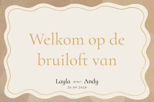 Dit prachtige, stijlvolle welkomstbord met goudlook voor jullie bruiloft is een perfecte manier om jullie gasten te ontvangen. Het bord is in beige- en bruintinten vormgegeven met een golvend kader in het midden. Pas het welkomstbord naar eigen wens aan in onze online editor. Het formaat van het welkomstbord is 60 x 40 cm.