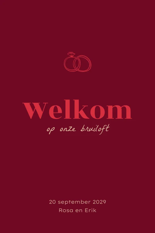 Hip welkomstbord om alle gasten welkom te heten op jullie bruiloft. Dit donkerrode bord heeft een illustratie van twee ringen. Pas het bord makkelijk zelf aan in de online editor.