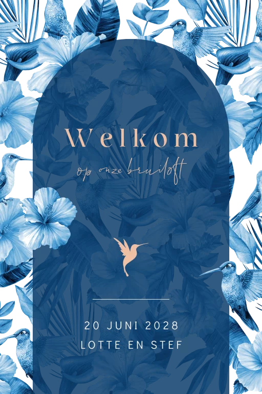 Een welkomstbord voor jullie bruiloft! Een heel leuk welkom voor al jullie gasten. Op dit bruiloftsbord zie je in Delfts blauwe kleuren verschillende bloemen, bladeren en kolibries. Maak dit welkomstbord persoonlijk door de teksten aan te passen in de editor. Dit welkomstbord past bij de Delfts blauwe trouwhuisstijl.