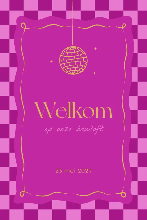 Dit kleurrijke welkomstbord is een opvallende aanvulling op jullie bruiloftsdag. Dit trouwbord heeft een geblokt patroon, een speels kader en een discobal als illustratie. Laat jullie gasten versteld staan met dit sprankelende bord.