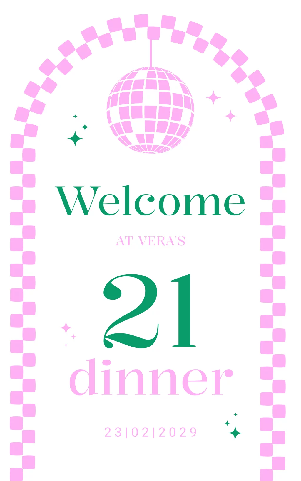 Dit stijlvolle welkomstbord in de vorm van een arch is de perfecte manier om je gasten voor jouw 21 diner welkom te heten. Het bord is wit en heeft een felroze en groene bedrukking! Heb je hulp nodig? Wij helpen je graag! Uitgesneden uit formaat 46 x 73 cm.