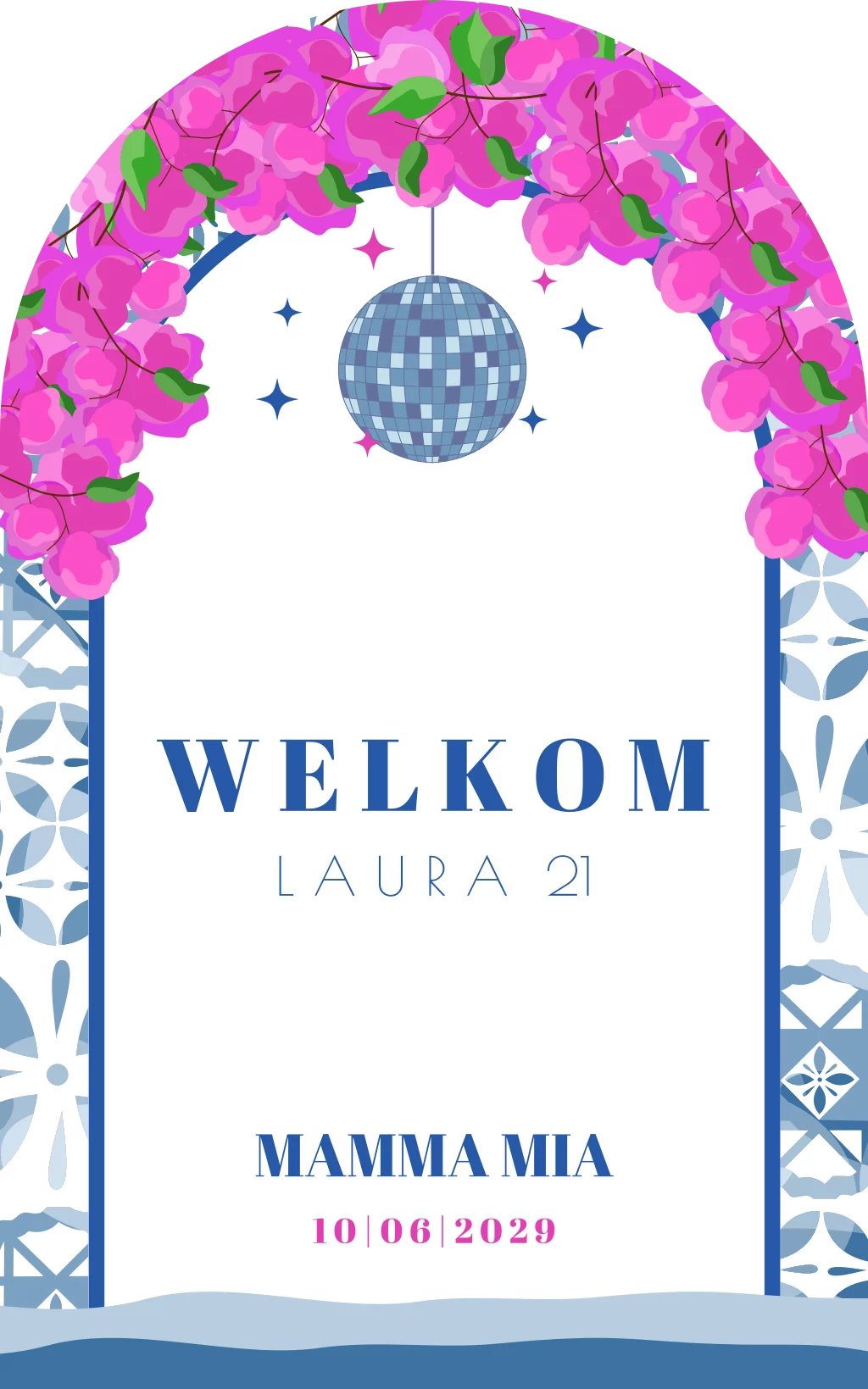 Organiseer een 21 diner met een Mamma Mia thema. Dit welkomstbord in boogvorm is daar zeker geschikt voor. Op dit welkomstbord zie je opvallende bloemen, een boogkader en een discobal. Maak je 21 diner compleet met dit prachtige tuinbord en maak er een onvergetelijke verjaardag van. Uitgesneden uit formaat 46 x 73 cm.