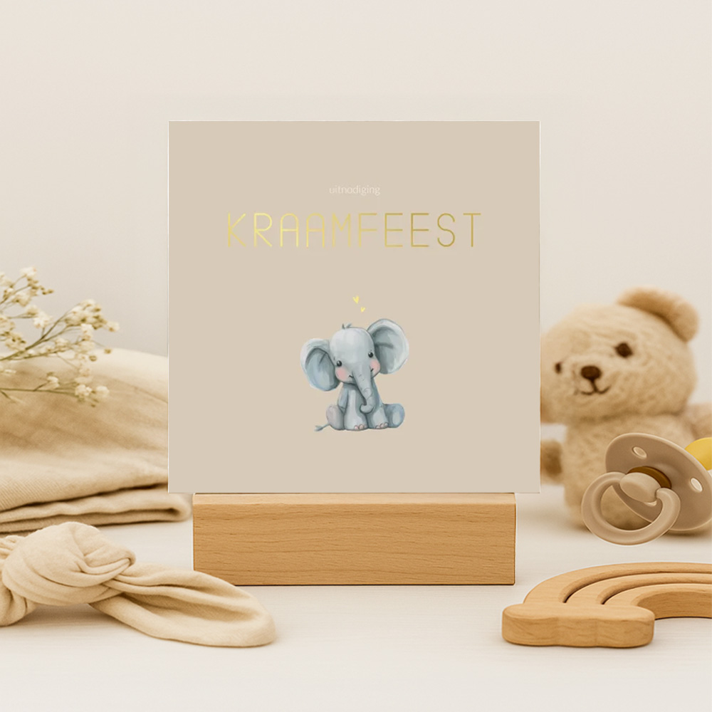 Vier de geboorte van jullie zoon of dochter in stijl met dit prachtige unisex kraamborrelkaartje! Het ontwerp heeft een warme beige achtergrond en een lieve illustratie van een babyolifant in het midden. Boven de olifant staat het woord 'kraamfeest' in elegante gouden foliedruk letters, met daarboven subtiel het woord 'uitnodiging' in wit. Dit kaartje is ideaal om familie en vrienden uit te nodigen voor een onvergetelijk kraamfeest. Dit mini kraamborrelkaartje past perfect bij dit geboortekaartje. Pas de teksten, lettertypes en kleuren eenvoudig aan in de editor.