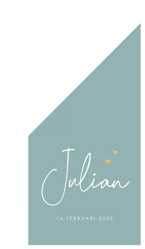 Basic geboortevlag voor een jongen met een groen/blauwe kleur. Op de vlag staan 2 hartjes en er is ruimte voor de naam en geboortedatum van jullie kleintje.