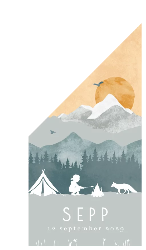 Een avontuurlijke geboortevlag voor een jongen. Op deze vlag zie je een silhouet van een jongetje dat aan het kamperen is. Je ziet de bergen, de zon, een vos en een tent. Vier met deze geboortevlag de geboorte van jullie zoon.