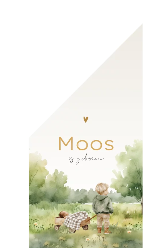 Aquarel getekende geboortevlag om de geboorte van jullie zoon aan te kondigen. Ook leuk en origineel om met buren, familie of vrienden deze geboortevlag op te hangen en de tuin te versieren om de geboorte van de baby te vieren. Op deze vlag Moos staat een jongetje naast een karretje waar zijn broertje in ligt in een aquarel geschilderd landschap. Boven de naam staat een klein hartje.