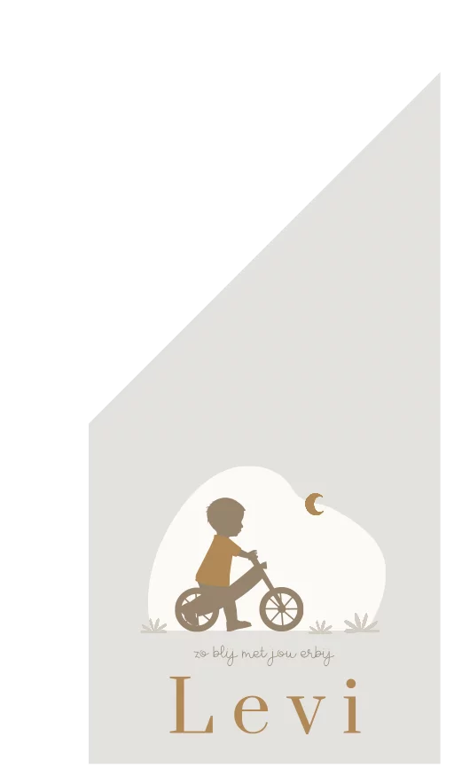 Rustige geboortevlag met een silhouet van een jongen op een loopfietsje met maantje op de achtergrond. Deze geboortevlag heeft mooie neutrale kleuren. Versier met deze geboortevlag de tuin en vier de geboorte van de nieuwst telg in de buurt of familie.