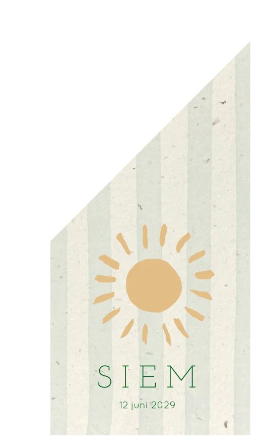 Deze geboortevlag Siem is een prachtige keuze om de geboorte van jullie zoon aan te kondigen. Ook leuk en origineel om met buren, familie of vrienden deze geboortevlag op te hangen en de tuin te versieren om de geboorte van de baby te vieren. Op deze vlag zie je een gestreepte achtergrond met een vrolijke zon en de naam Siem staan.