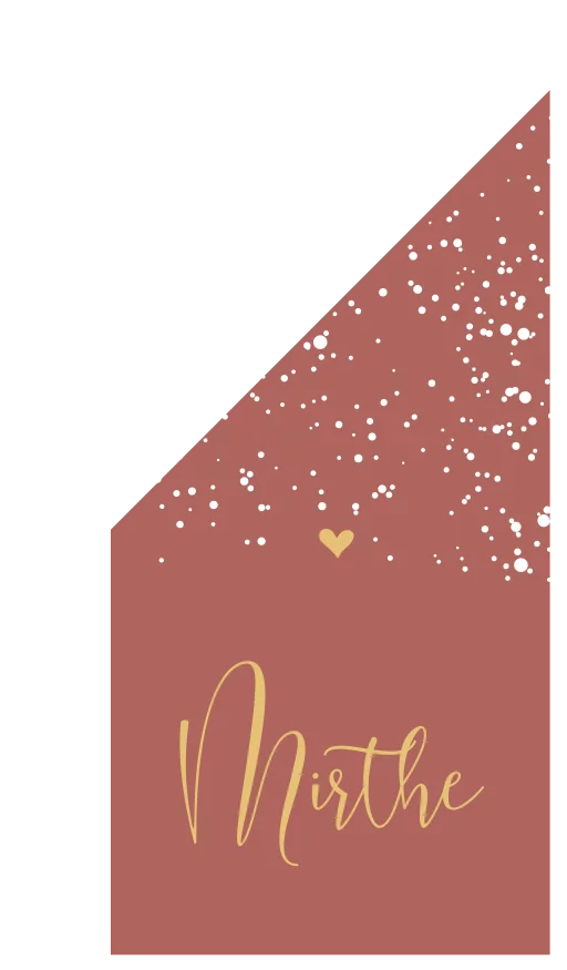 Een geboortevlag voor een meisje met donkerroze achtergrondkleur. Op de vlag staan spetters, naam en een gouden hartje. Leuk om zelf of als buren, vrienden of familie de tuin mee te versieren en de geboorte van de baby te vieren.