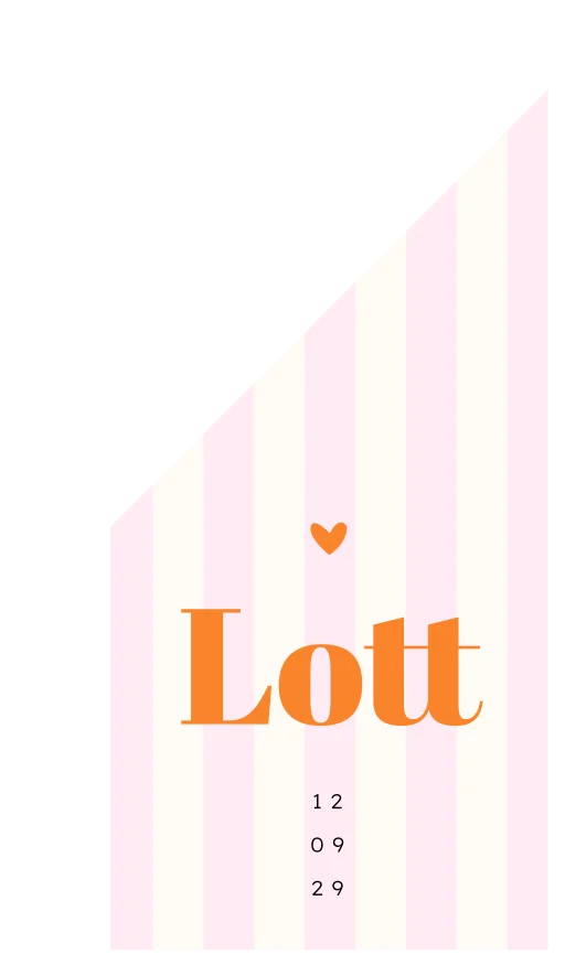 Hoera een meisje geboren! Vier dit heugelijke nieuws met een vrolijke geboortevlag. Ook leuk en origineel om met buren, familie of vrienden deze geboortevlag op te hangen en de tuin te versieren om de geboorte van de baby te vieren. Op deze vlag Lott staan roze met witte strepen en de naam van de baby met een hartje in oranje.