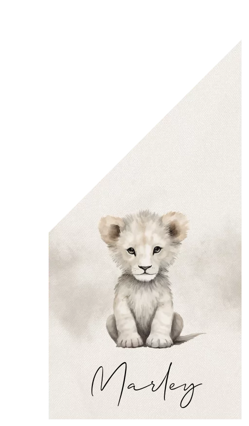 Een unisex geboortevlag voor een jongen of meisje in zachte natureltinten. Op de vlag staat een illustratie van een schattig leeuwen welpje. De naam van jullie zoon of dochter wordt gedrukt in sierlijke zwarte letters. Hang de vlag uit en vier de geboorte van jullie kleine jongen of meisje. Ook een leuke en originele manier om als buren, familie of vrienden de tuin te versieren en de geboorte te vieren.
