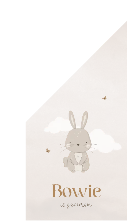 Een geboortevlag met een lief konijntje tussen de wolken en vlindertjes. Deze vlag heeft nude beige kleuren en is daardoor genderneutraal en geschikt voor zowel een jongen als een meisje. Leuk en origineel om met buren, familie of vrienden deze geboortevlag op te hangen en op deze manier de tuin te versieren om de geboorte van de baby te vieren.