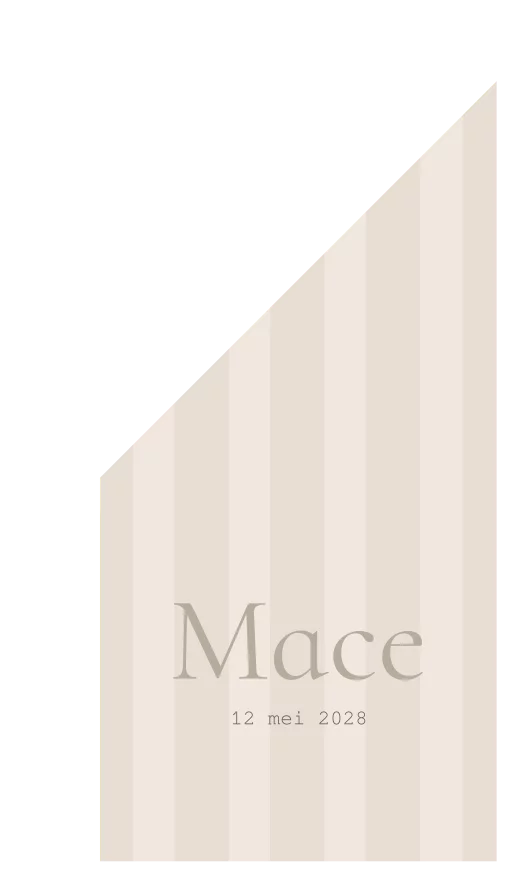 Deze unisex geboortevlag Mace is een prachtige keuze om de geboorte van jullie zoon of dochter aan te kondigen aan de hele buurt. Ook leuk en origineel om met buren, familie of vrienden deze geboortevlag op te hangen en de tuin te versieren om de geboorte van de baby te vieren. Op deze vlag Mace staat een beige strepen patroon met de naam van de baby.