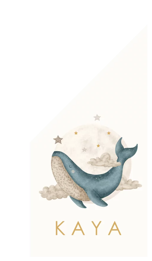 Een geboortevlag met een walvis onder een sterrenhemel. Op de achtergrond staat een maan. Deze geboortevlag is geschikt voor zowel een jongen als een meisje. Versier met buren, familie of vrienden op deze originele manier de tuin om de geboorte van de baby te vieren.