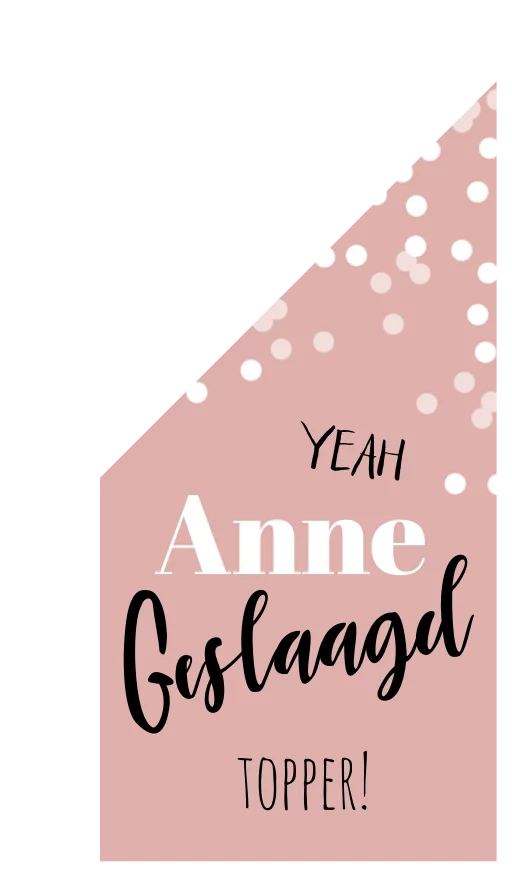 Vrolijke vlag voor iemand die geslaagd is. Op deze vlag een oudroze achtergrond met witte confetti, naam en de tekst 'Yeah, geslaagd topper!'. Pas de naam eenvoudig aan in de editor.