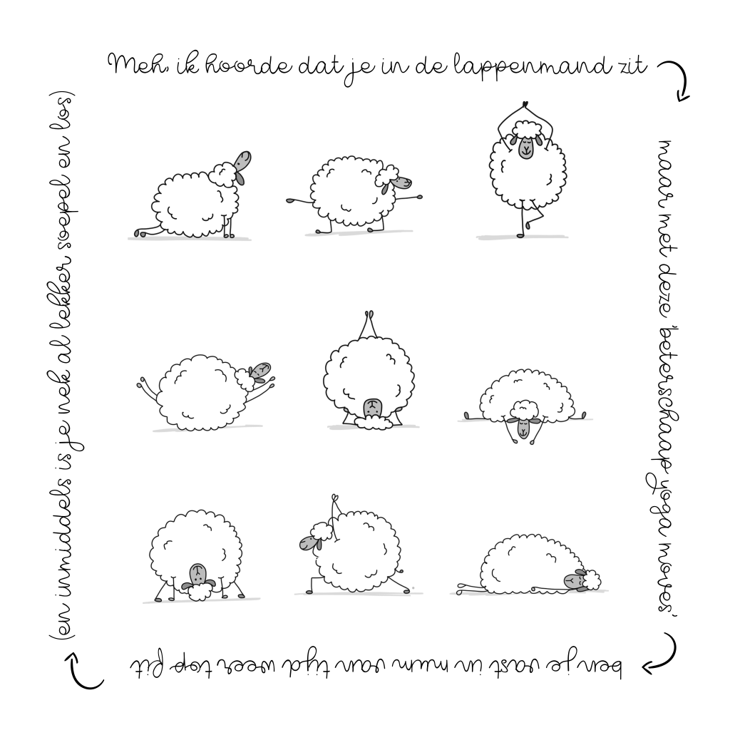Grappige beterschaapskaart met schaapjes die aan yoga doen. Wens iemand hiermee heel veel beterschap, en een soepele nek ;-)