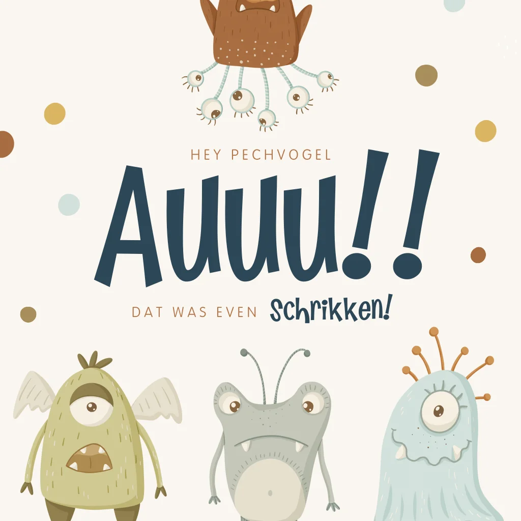 Auuu!! Dat was even schrikken, pechvogel. Wens een kind met deze grappige monsterkaart heel veel beterschap of een goed herstel.