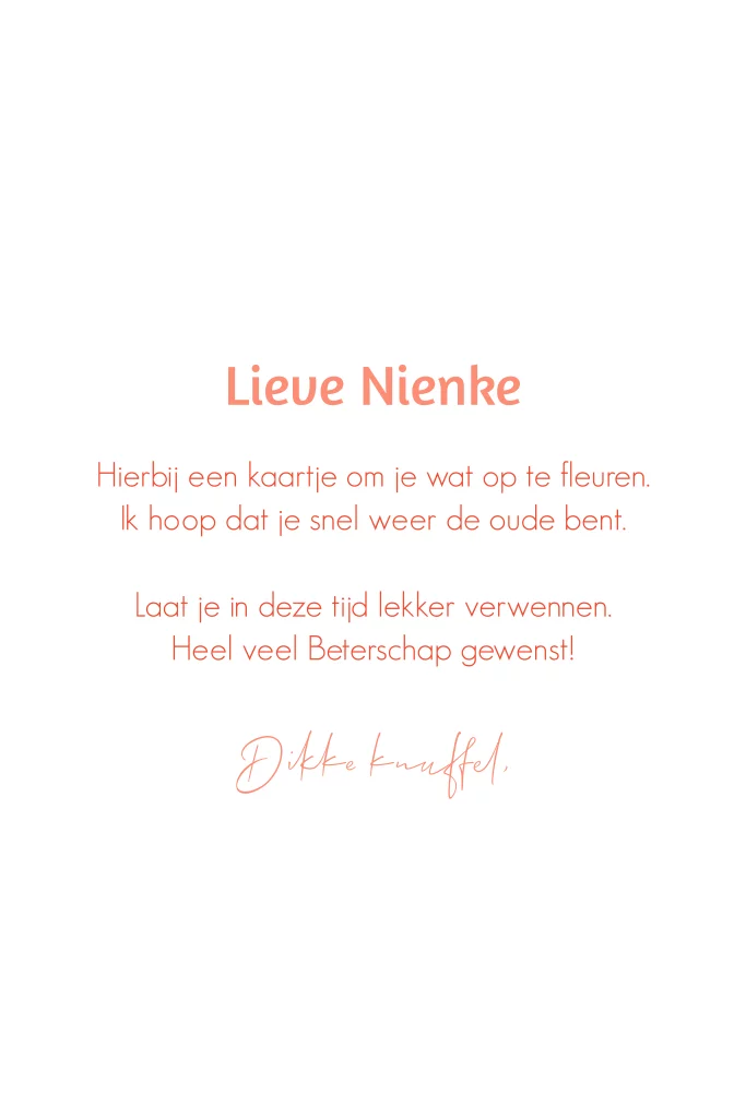 Wens iemand heel veel beterschap met deze prachtige beterschapskaart met bloemen. Laat je liefde en steun zien met deze bloemrijke beterschapskaart. Zet op de binnenzijde een persoonlijke tekst.