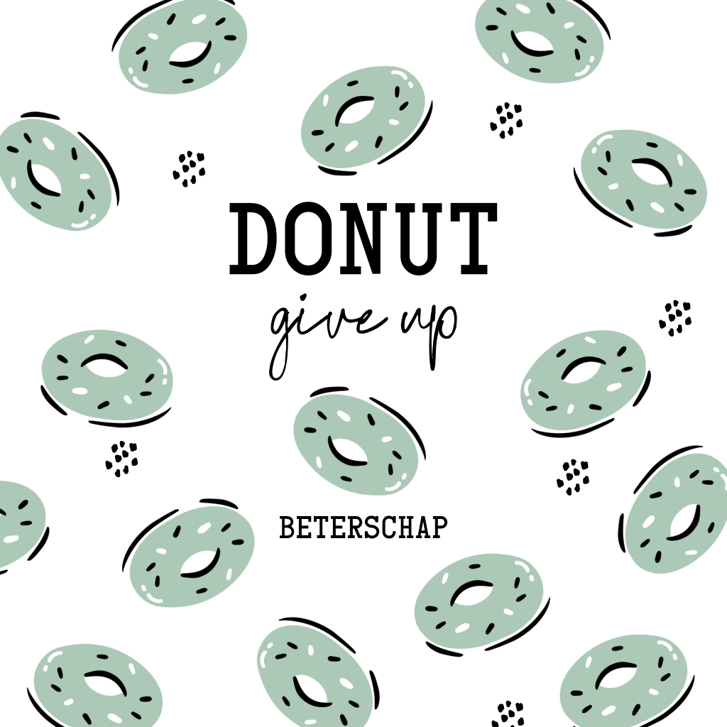 Hippe beterschapskaart met de tekst 'DONUT give up' en op de achtergrond een patroon van groene donuts met sprinkles.