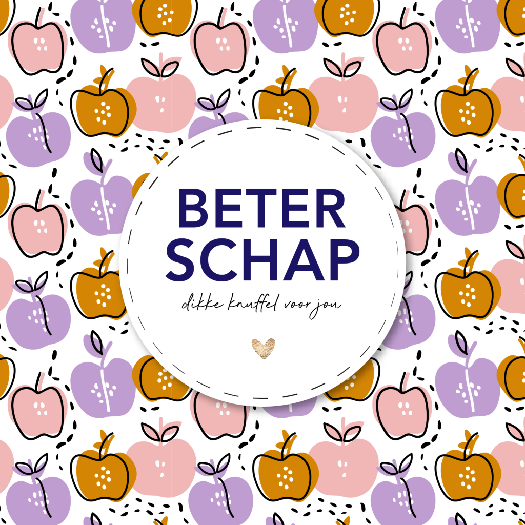 Een kaart met veel fruitige appels om iemand beterschap te wensen. Een beterschapskaart vol vitamines doet de zieke vast goed!