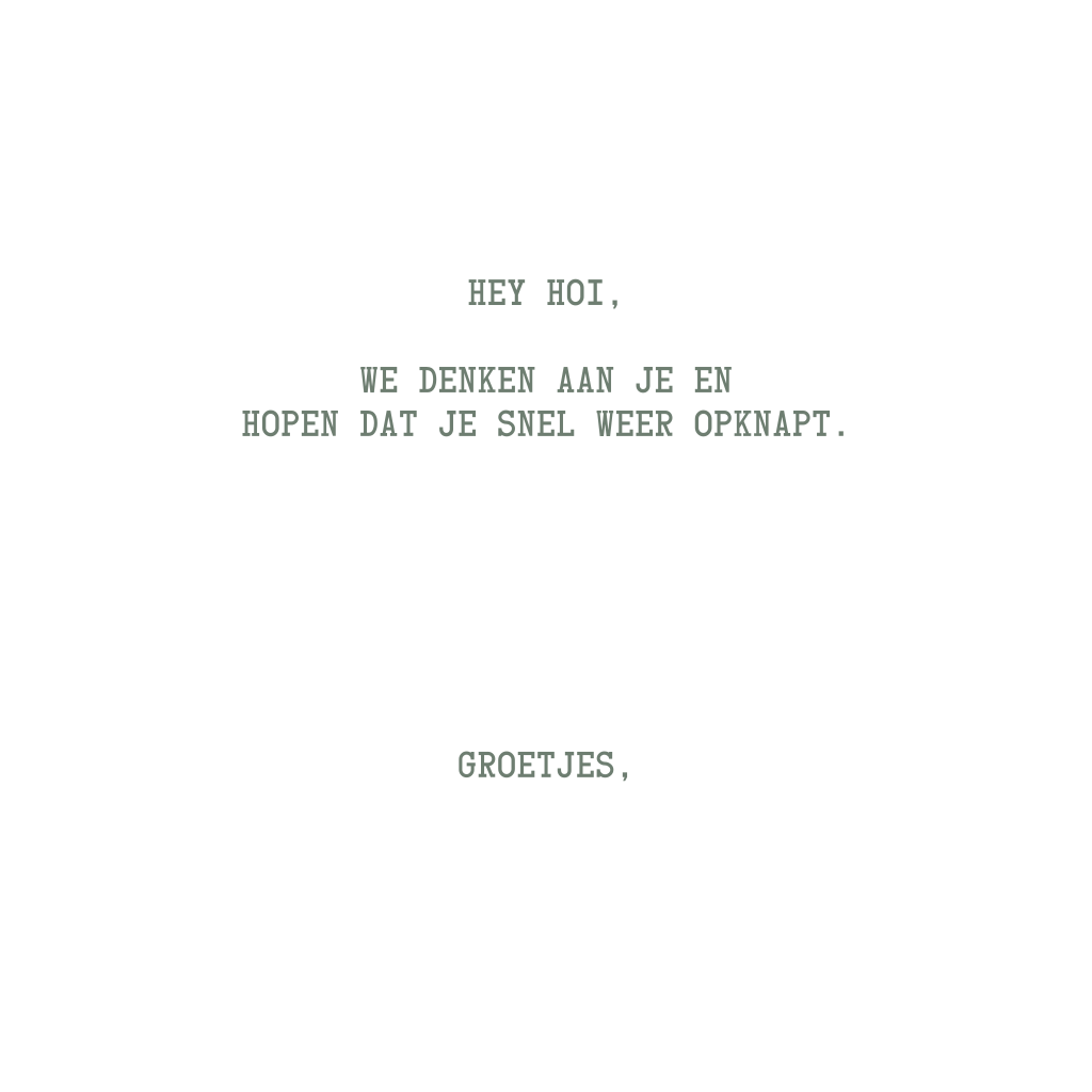 Stoere wenskaart om iemand heel veel beterschap te wensen en te laten weten dat je aan diegene denkt. Op deze beterschapskaart een groene achtergrond met een getekende schaap, oftewel een beterschaap. Voeg een persoonlijke sterkte wens toe op de binnenzijde. Zo voelt de zieke zich vast snel weer beter!