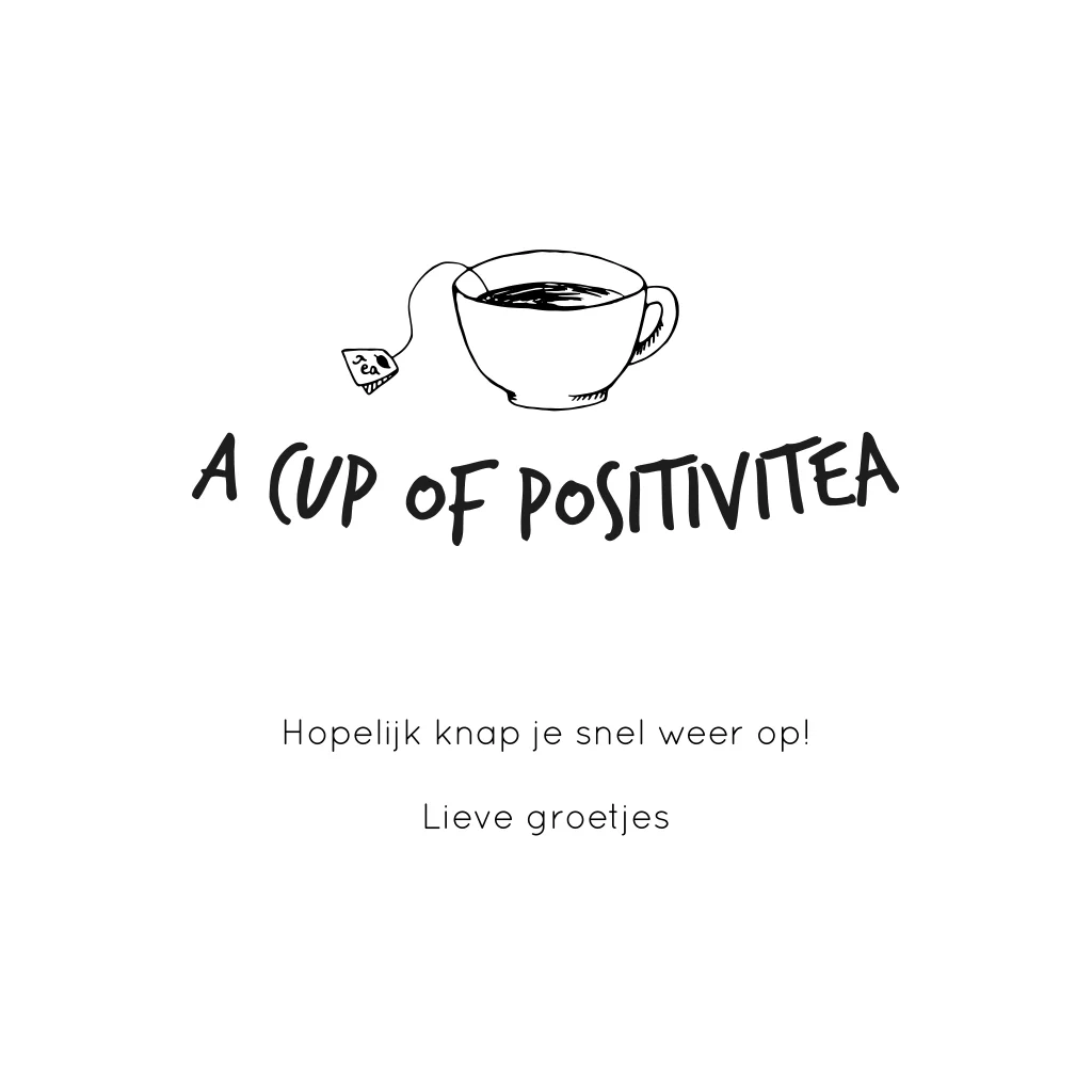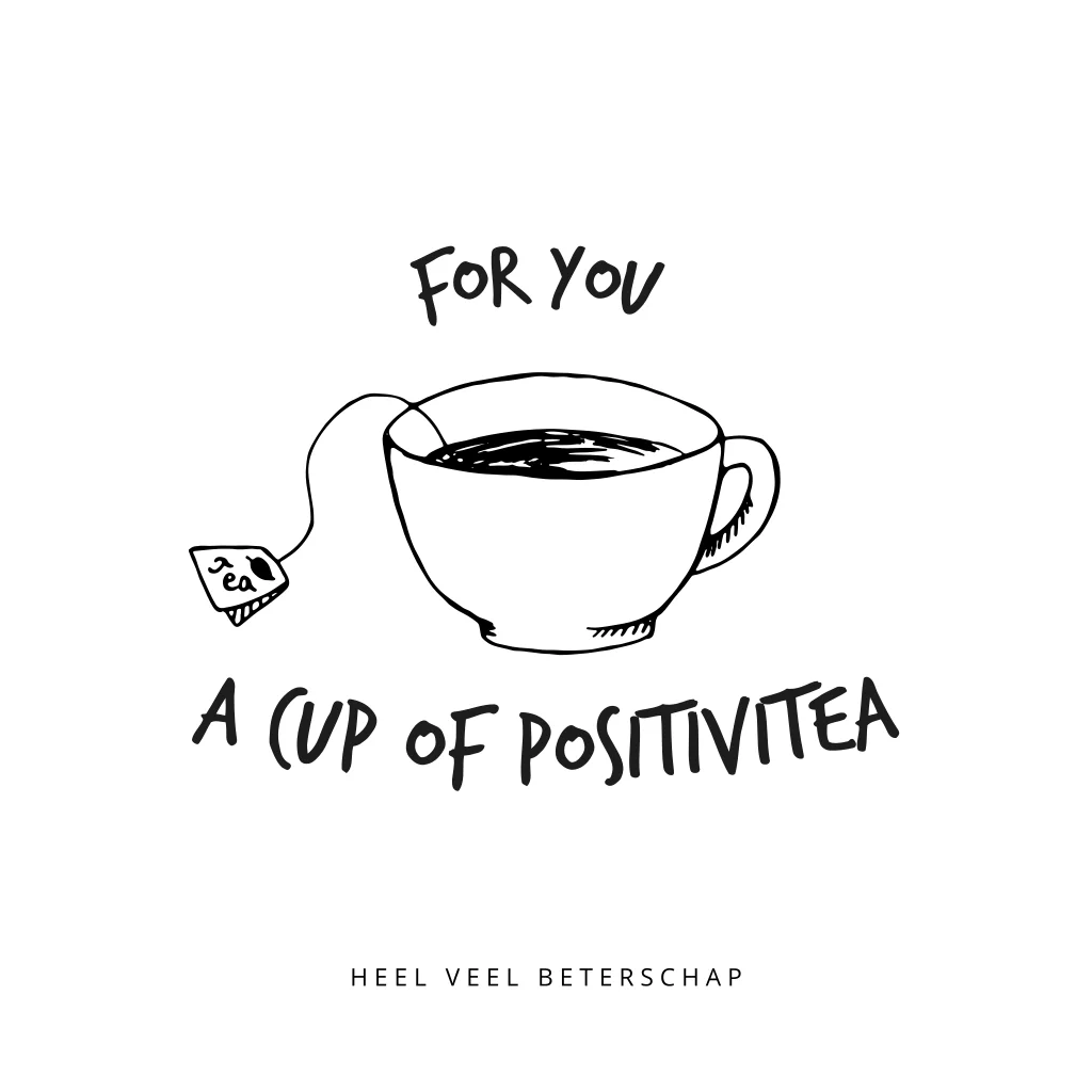 Ken jij iemand die wel wat positiviteit kan gebruiken? Stuur dan deze basic beterschapskaart. Op deze kaart zie je een geïllustreerd kopje thee en de tekst 'for you a cup of positivitea'. Het gehele beterschapskaartje is in zwart-wit stijl vormgegeven en dit kun je zelfstandig in de online editor aanpassen.