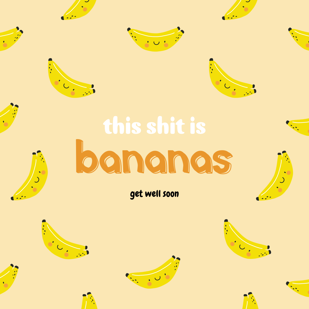 Vrolijke wenskaart om iemand heel veel beterschap te wensen. Op deze felicitatiekaart de grappige tekst ´this shit is bananas´ met heel toepasselijk, geïllustreerde banaantjes op de achtergrond.