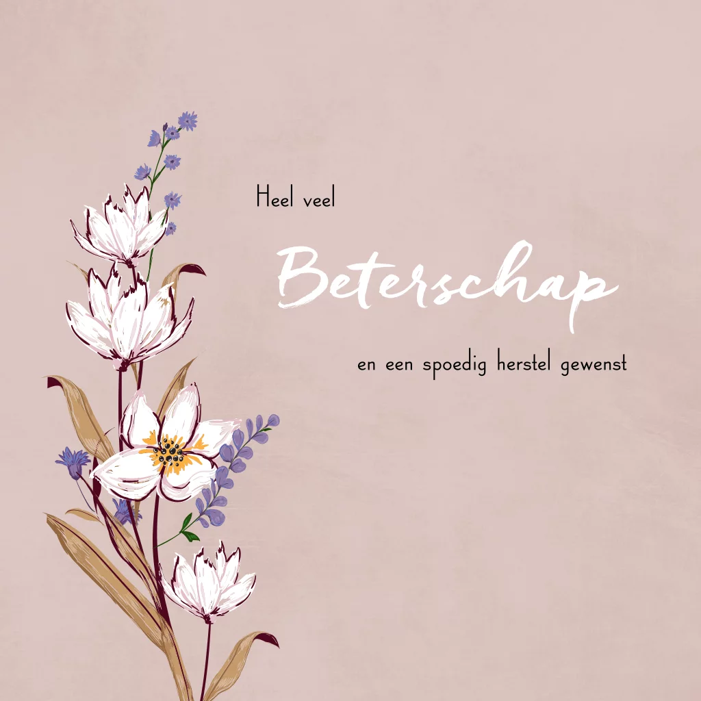 Mooie chique wenskaart met bloem. Wens iemand hiermee heel veel beterschap en een spoedig herstel. Stuur deze kaart naar een zieke of iemand die in het ziekenhuis ligt na een operatie. Pas de tekst gemakkelijk aan in onze editor.