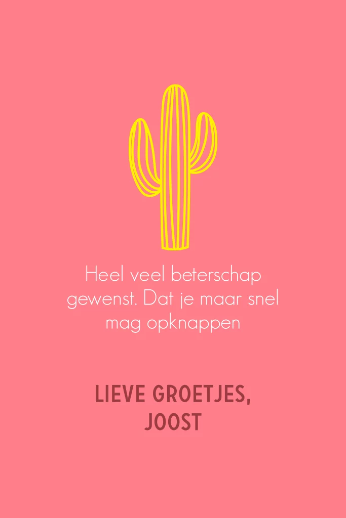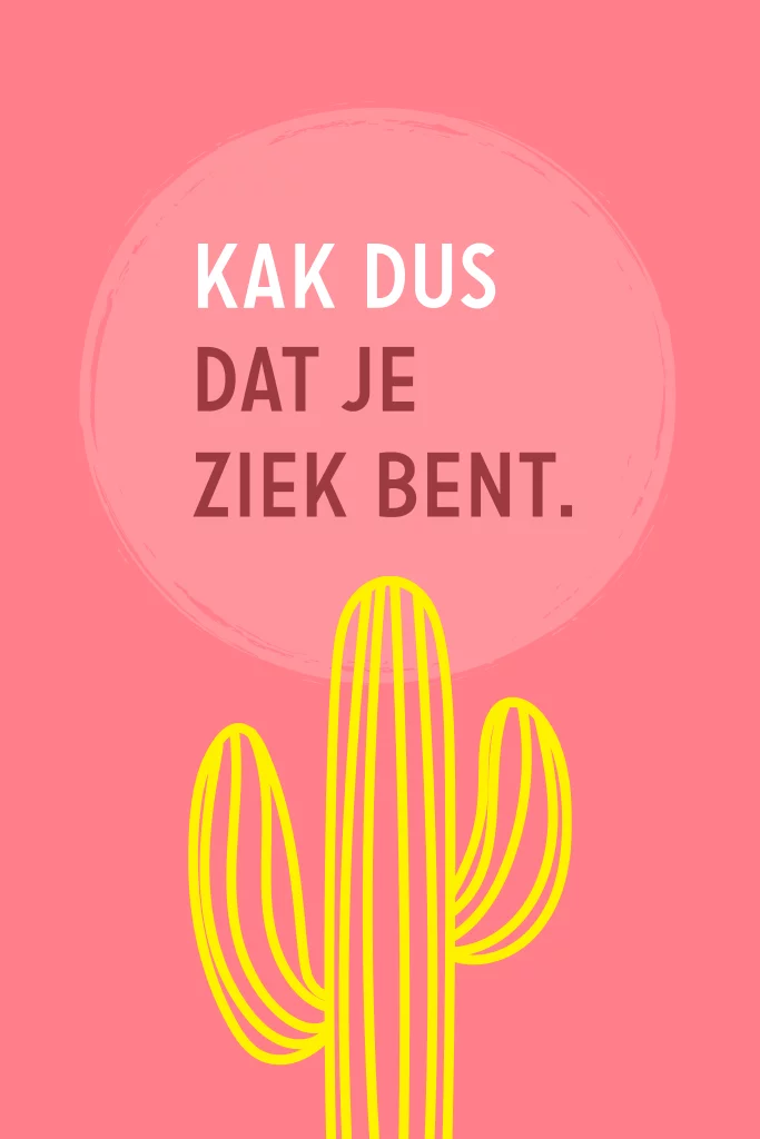 Of het nu gaat om een vriend, familielid of collega, deze beterschapskaart is een goede manier om je steun en medeleven te tonen. Op deze kleurrijke kaart zie je een grote cactus en de tekst 'Kak dus dat je ziek bent.' Met deze woordgrap en de vrolijke kleuren kun je de ontvanger een beetje opvrolijken!