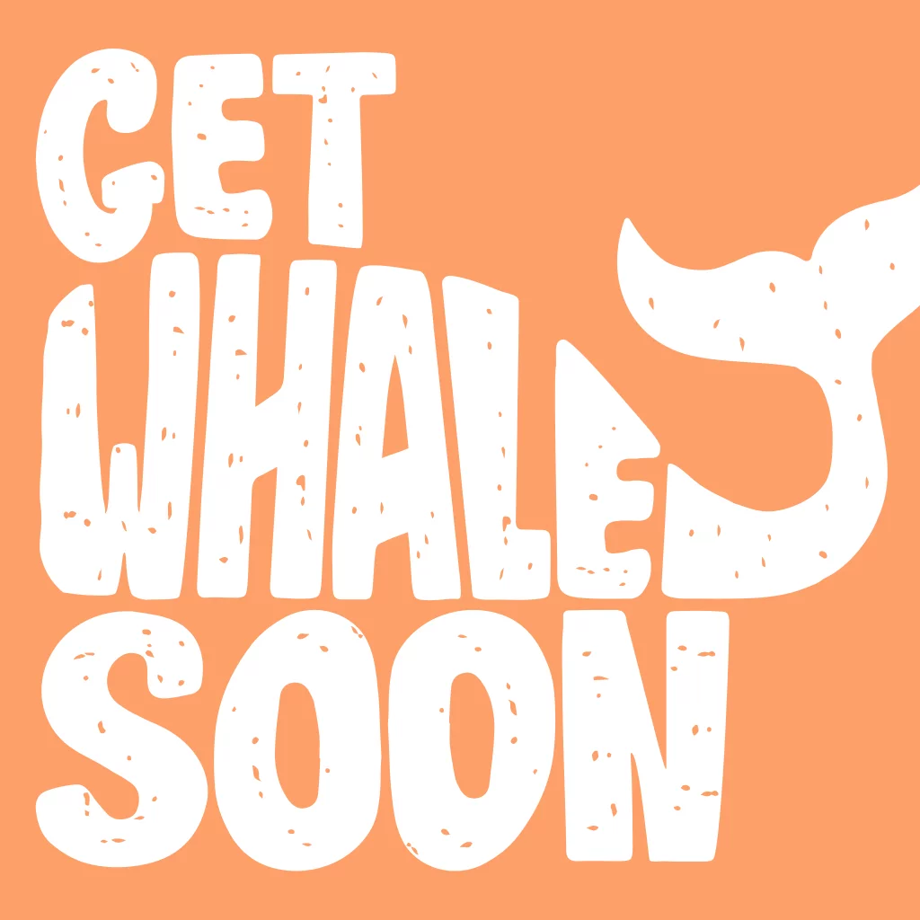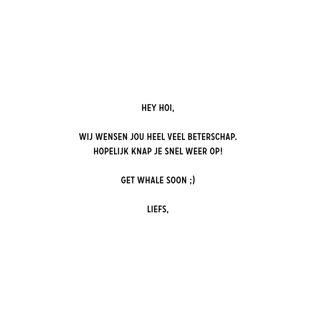 Stuur iemand deze 'get whale soon' beterschapskaart toe en laat weten dat je aan hem of haar denkt. Op deze kaart zie je de tekst 'whale' in de vorm van een walvis. Deze kaart heeft een oranje achtergrond en witte letters. Met deze kleursamenstelling valt de tekst en de vorm van de walvis goed op!
