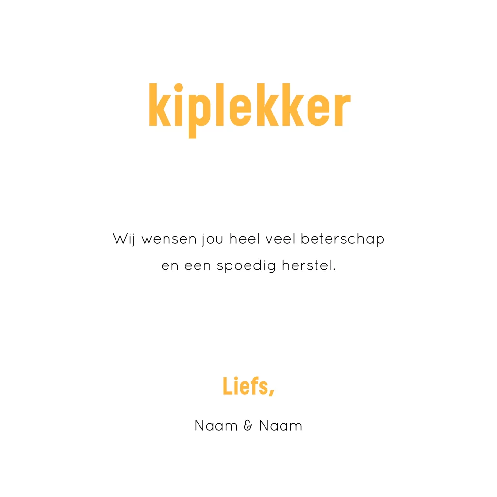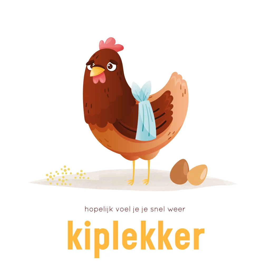 Een beterschapskaart voor een kind die het goed kan gebruiken! Op deze kaart zie je een ziek kippetje met een gebroken vleugel. Op deze kaart staat de tekst 'hopelijk voel je je snel weer kiplekker'. Een opbeurend kaartje voor de ontvanger.